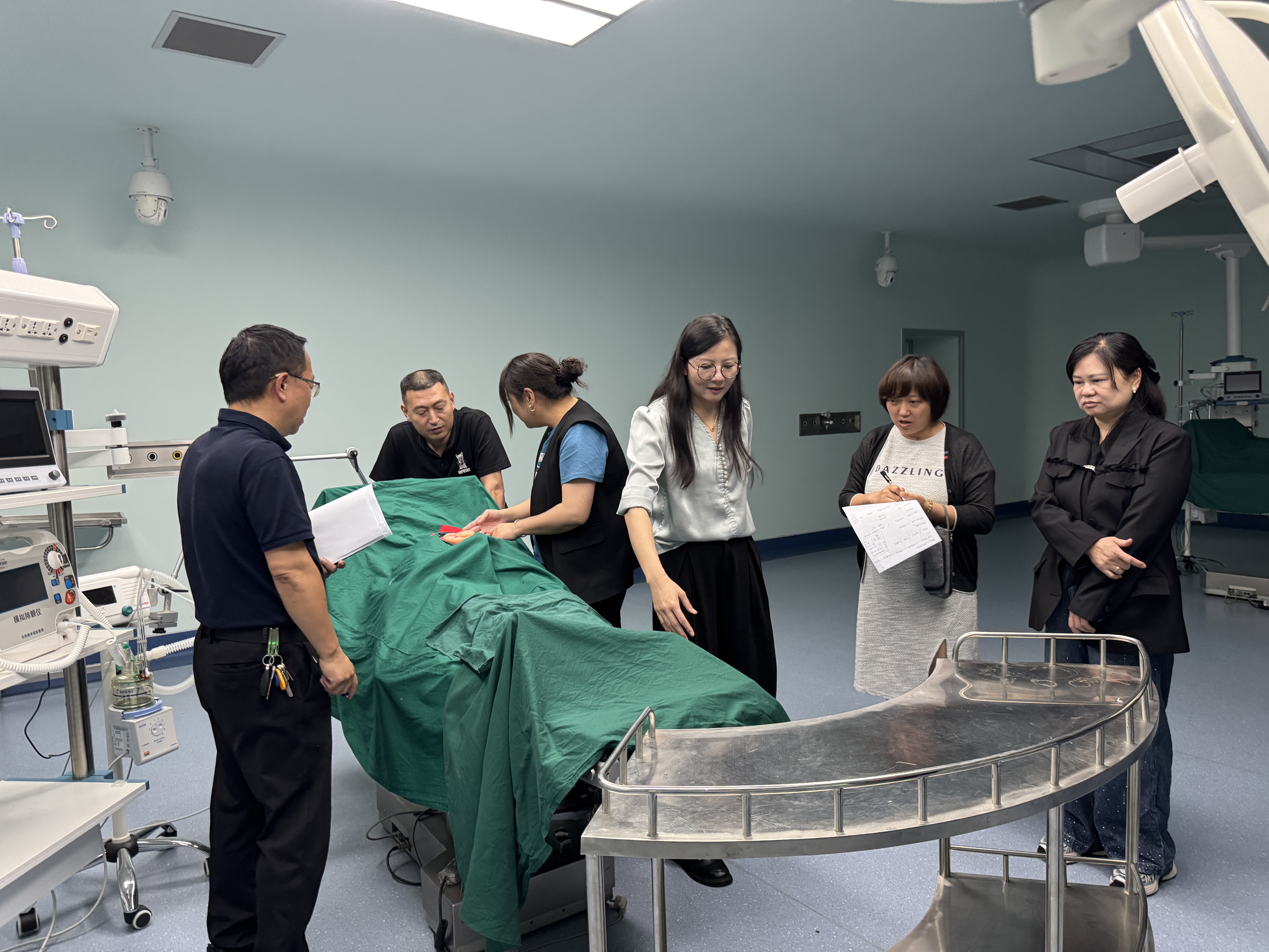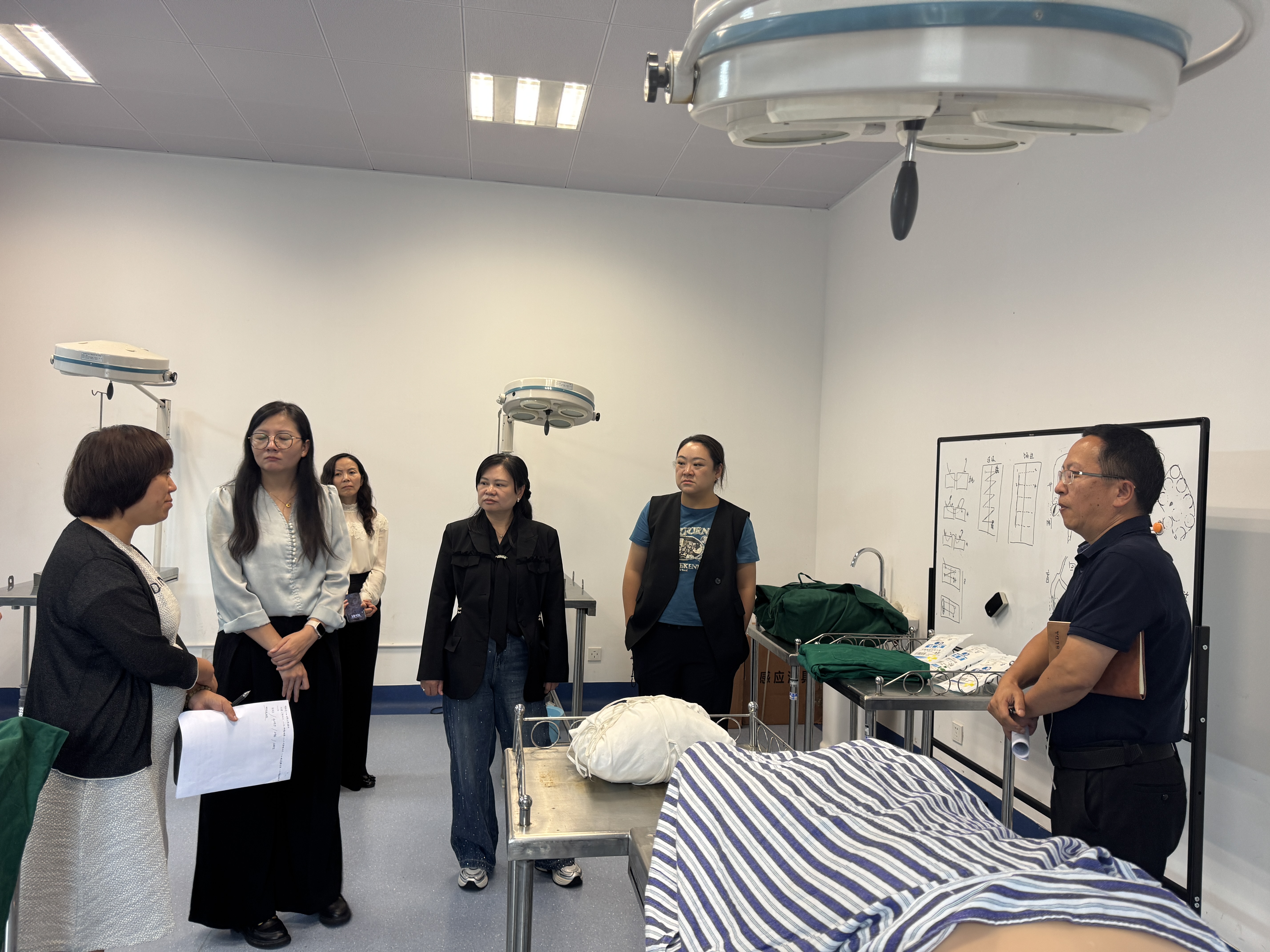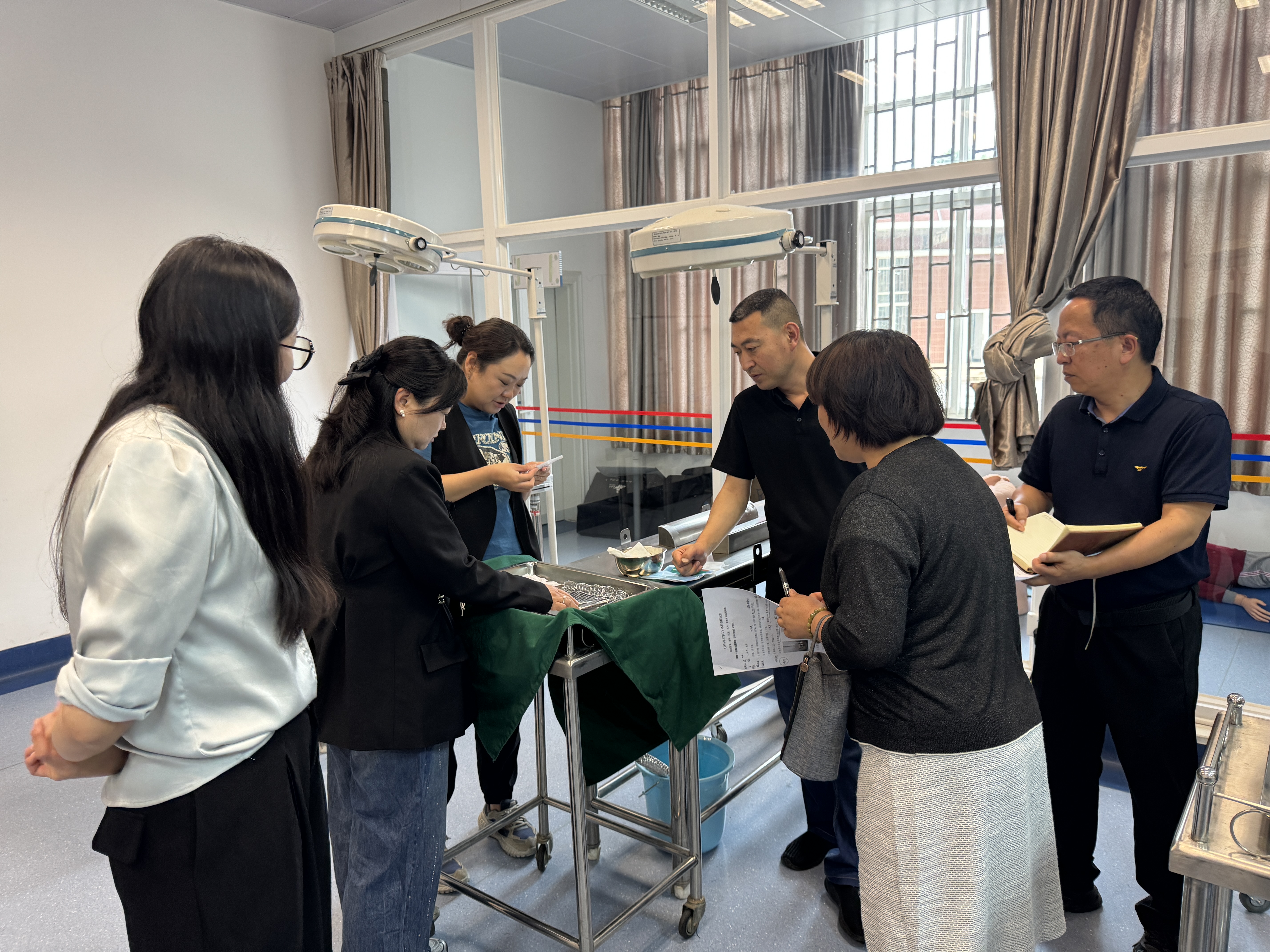 随后,专家深入外科手术室,对外科实验教学的环境布局、物品摆放进行了实地考察,就模拟场景设置、物品准备规范、教学流程模拟、无菌观念培养以及教学安全保障等关键环节给予了现场指导。