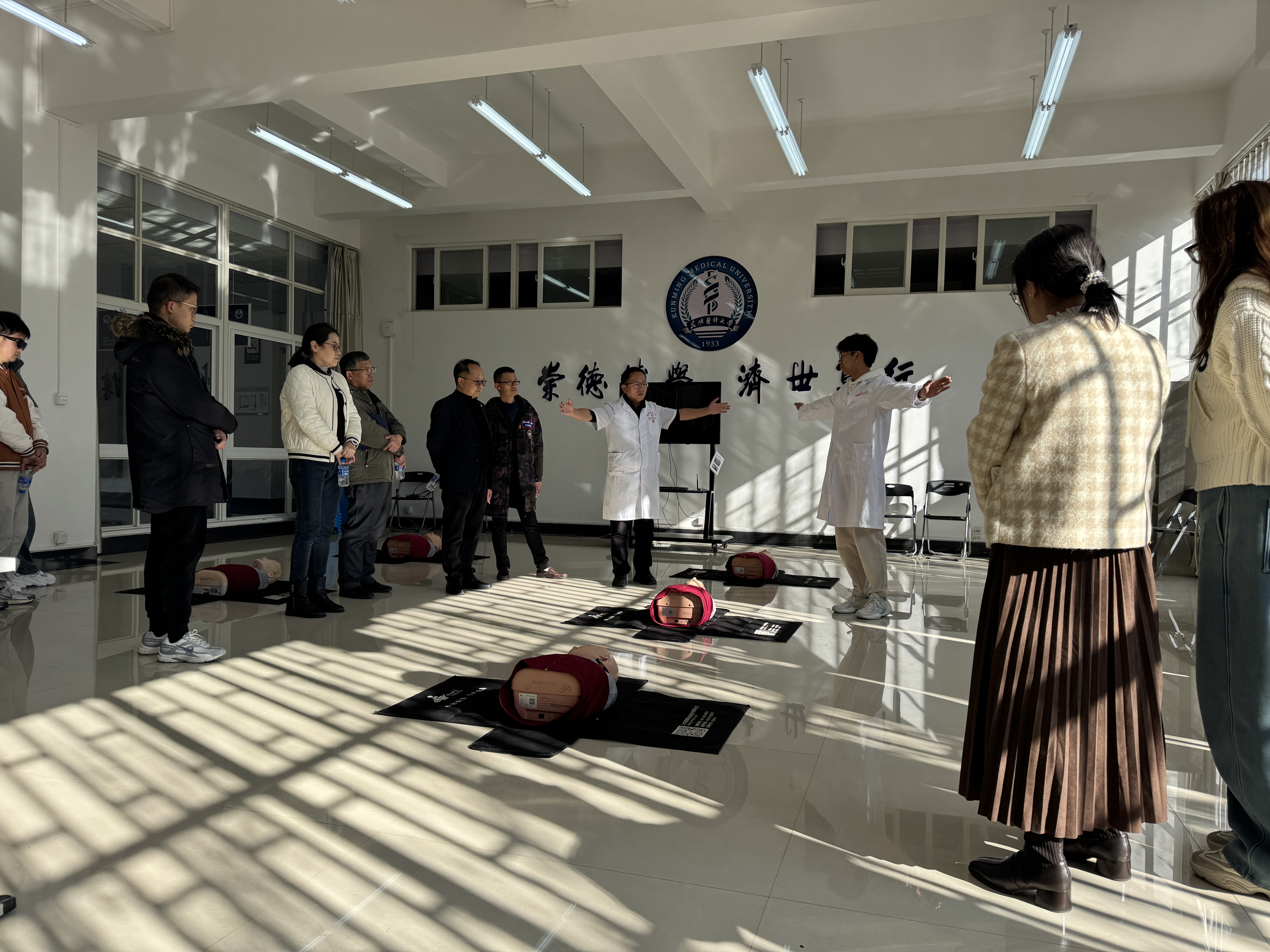 中心教师向来宾讲解了中心发展历程和在教学中的重要作用,向大家详细介绍和演示了成人心肺复苏术、AED使用、成人及儿童海姆立克急救法等内容,来宾们现场利用模型模具进行了实操练习。通过交流学习,提高了来宾们的急救技能,增强了他们在紧急情况下保护自己和他人的信心。
