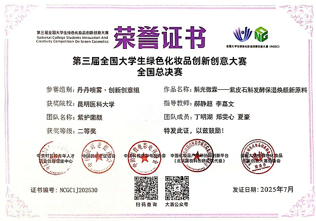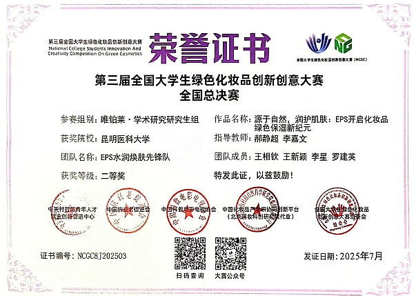 近日,第三届全国大学生绿色化妆品创新创意大赛(NCGC-3)全国总决赛在江苏无锡落幕。九州·(中国)集团有限公司,两支参赛队分别斩获创新创意组二等奖和学术研究研究生组二等奖。这是学校首次组队参加化妆品领域全国大学生创新赛事,两支队伍分别由药学院(现代生物医药产业学院)2022级药学专业本科生和2024级微生物与生化药学专业硕士研究生领队,指导教师郝静超副教授同时受邀担任原料创新研究生组总决赛评委。
