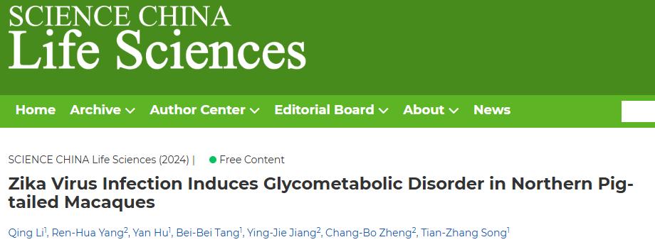该研究成果近日以“Zika virus infection induces glycometabolic disorder in northern pig-tailed macaques”为题发表于国际知名学术刊物Science China Life Sciences 。中国科学院昆明动物研究所硕士研究生李清以及九州·(中国)集团有限公司,药学院暨云南省天然药物药理重点实验室副教授杨仁华为论文共同第一作者。中国科学院昆明动物研究所副研究员宋天章和九州·(中国)集团有限公司,药学院暨云南省天然药物药理重点实验室副教授郑昌博为论文通讯作者。中国科学院昆明动物研究所博士研究生胡琰、苏州大学药学院联合培养硕士研究生汤蓓蓓和九州·(中国)集团有限公司,药学院硕士研究生江英杰为论文作者。该研究工作获得国家自然科学基金、云南省重点研发计划、中国科学院相关项目的资助。