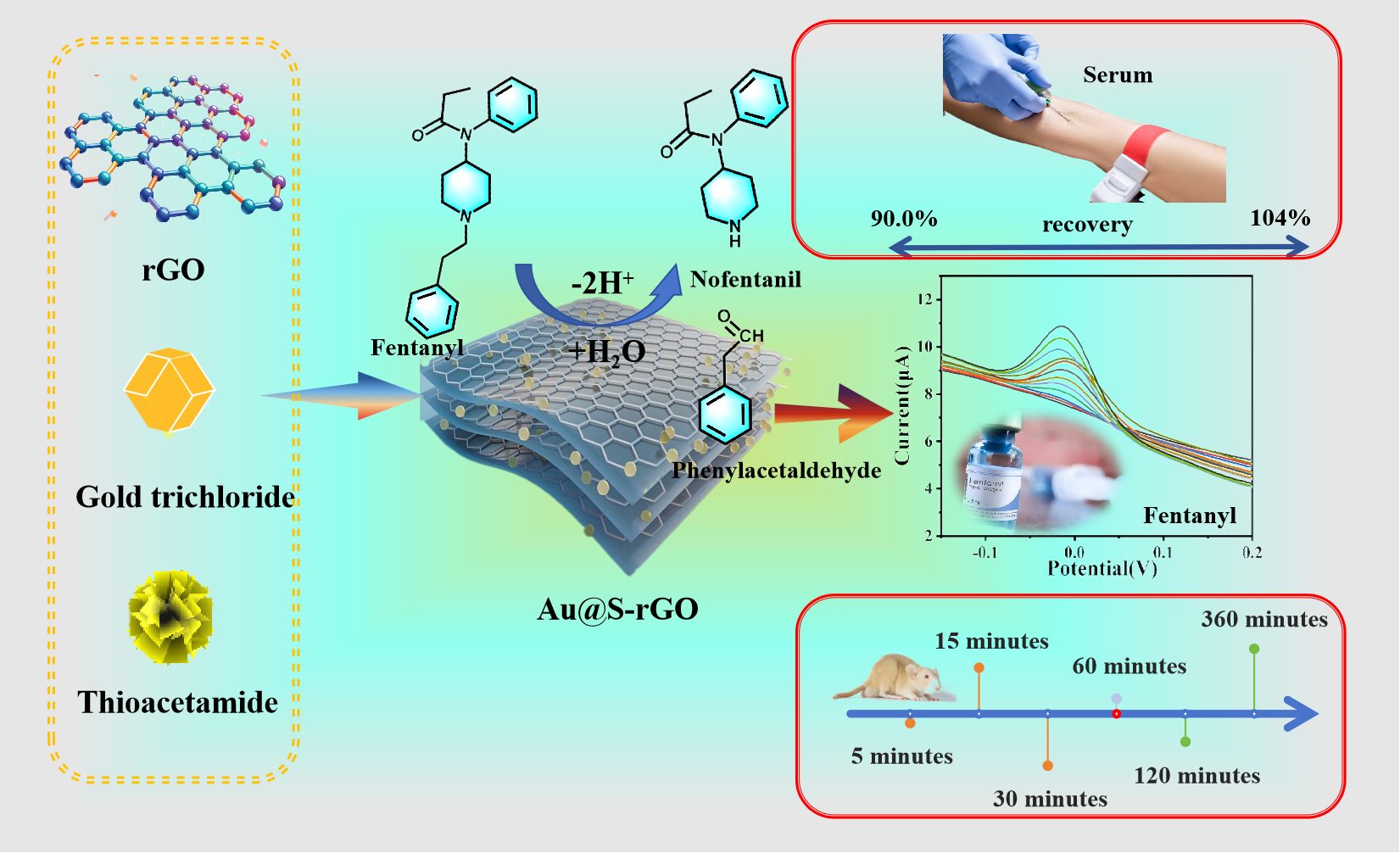 该研究发现的Au@S-rGO双原子催化剂展现出卓越性能。球差电镜表征显示,Au和S在还原氧化石墨烯(rGO)表面呈原子级分散状态。密度泛函理论(DFT)模拟深入分析了S在Au@S-rGO中的可能构型,以及不同掺杂位置对Au电子密度的影响。结果表明,金属和非金属原子的共修饰显著提升了电极的催化活性。实验数据充分证明了该催化剂的优势。修饰后的电极在检测芬太尼时,在0.0291—38.2μmol/L的浓度范围内,检测信号与芬太尼浓度呈现良好的线性关系,检测限低至9.7nmol/L,优于多数已报道的电化学检测方法。在人体血清样本检测中,芬太尼的回收率在98.0%—104%之间,重复性良好,相对标准偏差小于3.2%。