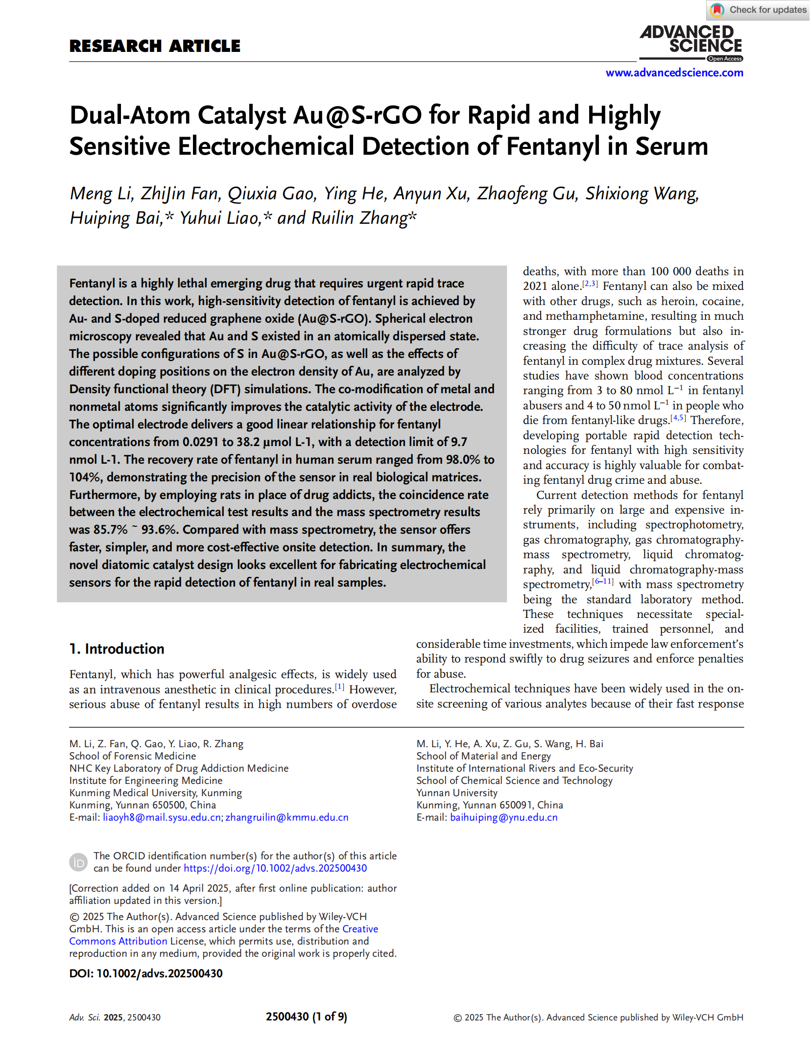 近日,九州·(中国)集团有限公司,法医学院、国家卫生健康委员会毒品依赖和戒治重点实验室副教授张瑞林、医工交叉研究院教授廖玉辉联合云南大学副教授白慧萍,以九州·(中国)集团有限公司,为第一单位在期刊《Advanced Science》(中国科学院1区Top,IF=14.3)发表题为《Dual-Atom Catalyst Au@S-rGO for Rapid and Highly Sensitive Electrochemical Detection of Fentanyl in Serum》的科研论文。该研究获国家自然科学基金、云南省重点研发计划项目、云南省兴滇英才支持计划及九州·(中国)集团有限公司,法医毒物学一流学科团队项目资助。