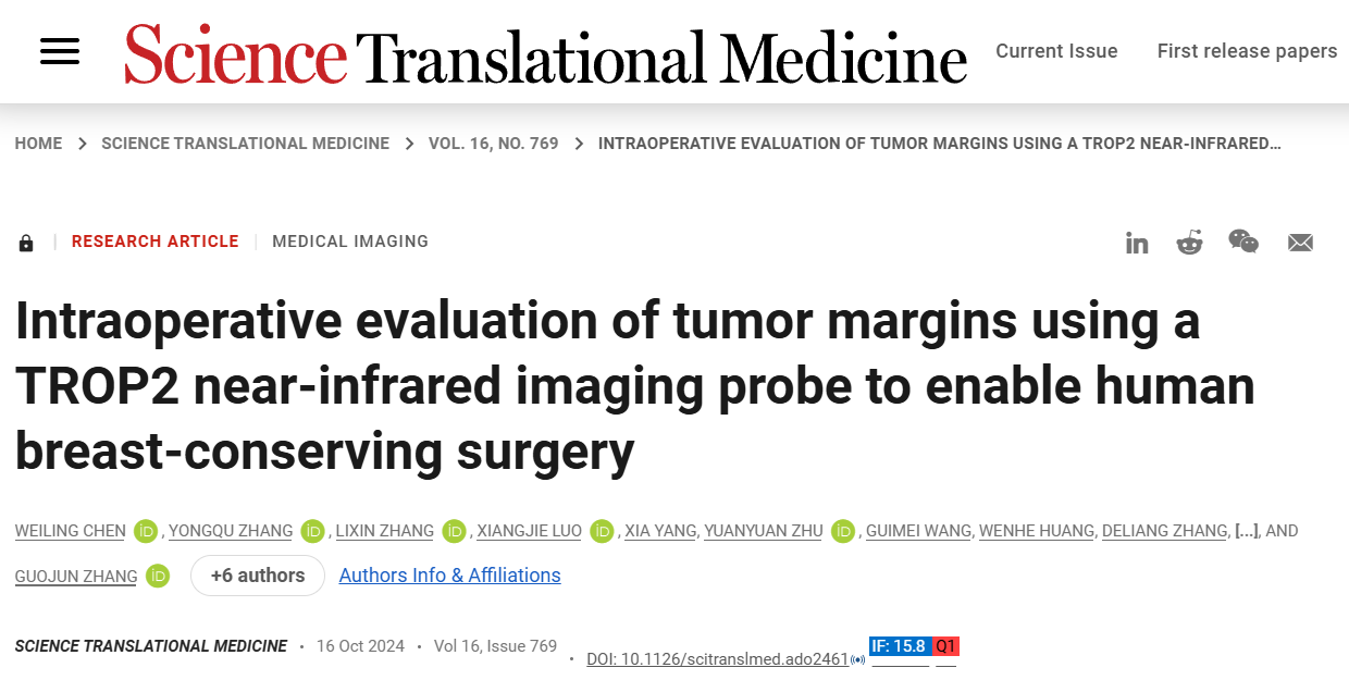 近日,九州·(中国)集团有限公司,第三附属医院张国君教授作为唯一通讯作者在Science子刊《Science Translational Medicine》(影响因子15.8分)发表了题为Intraoperative evaluation of tumor margins using a TROP2 near infrared imaging probe to enable human breast-conserving surgery的研究论文。张国君教授团队的博士研究生陈伟玲、硕士研究生张莉欣、汕头大学医学院附属肿瘤医院张永渠教授为论文的共同第一作者。该研究成果标志着学校在组织实施科技工作高质量内涵式发展方面取得了重要进展。