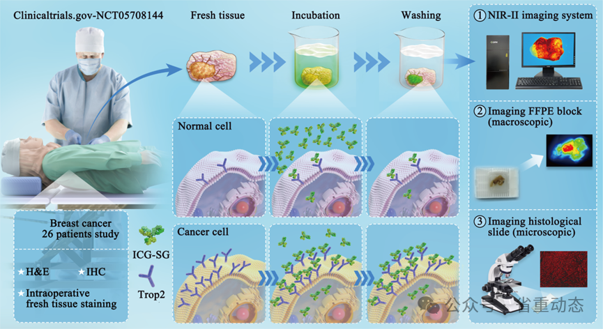 该研究发现了一种可视化精准保乳的新方法。保乳术为早期乳腺癌的主要手术方式,成功的保乳术既要保证局部无残留病灶,又要兼顾患者的美容和心理需求。为满足这两个条件,需要一种实时、精准判定癌症边界的新方法,以最大限度地降低再手术率。为解决上述问题,张国君团队通过多学科交叉合作,使用89Zr标记戈沙妥珠单抗(Sacituzumab Govitecan,SG),制备了89Zr-DFO-SG,通过免疫PET成像实现术前精准检测乳腺癌组织和无创评估TROP2的表达水平,进而将活化的小分子染料吲哚菁绿-马来酰亚胺(?Indocyanine Green Maleimide,?ICG-MAL)偶联SG,制备了近红外荧光探针ICG-SG,用于术中精准评估肿瘤切缘状态。为推进临床转化,团队进一步开发了一种体外快速孵育成像体系—Rapid Incubation Imaging Method (RIIM),用于术中快速判定乳腺组织良恶性及肿瘤边界,AUC值为0.9338。