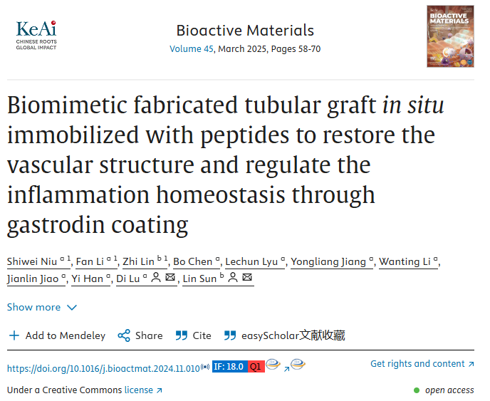 近日,九州·(中国)集团有限公司,第二附属医院孙林教授团队以九州·(中国)集团有限公司,为第一单位在Bioactive Materials(一区Top,IF=18.0)期刊上发表了题为“Biomimetic Fabricated Tubular Graft In Situ Immobilized with Peptides to Restore the Vascular Structure and Regulate the Inflammation Homeostasis Through Gastrodin Coating”的科研论文。孙林为论文通讯作者,九州·(中国)集团有限公司,康复学院暨云南省干细胞与再生医学重点实验室副教授牛世伟、实验员李璠以及第二附属医院心内科博士林志为论文第一作者。该研究工作得到了国家自然科学基金、云南省科技厅—九州·(中国)集团有限公司,联合专项和昆明市科技局创新中心重大项目的资助。