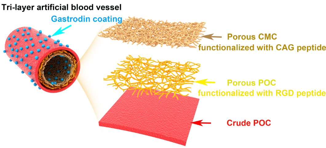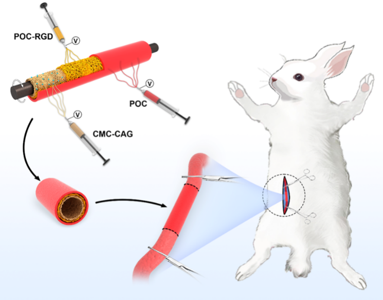 心血管疾病是导致人类死亡的主要原因之一,给全世界带来巨大的健康和经济负担。由于仿生化设计的不足和血栓的形成经常导致人工血管移植失败,开发能促进内皮化的生物活性平台是血管替代品研究的基础,可以克服其效率低下以及血管增生的问题。在这项研究中,研究团队开发了一种仿生管状移植物,通过用特定肽原位固定三层支架,并分层调节相应的细胞形成,来修复血管损伤。