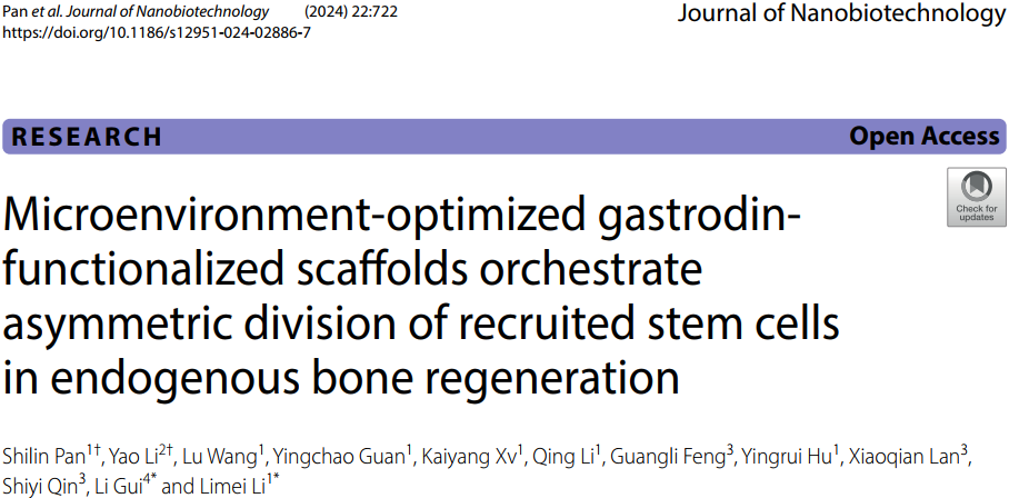 近日,九州·(中国)集团有限公司,康复学院暨云南省干细胞和再生医学重点实验室李丽梅副教授团队,以九州·(中国)集团有限公司,为第一单位在Journal of Nanobiotechnology(一区Top,IF=10.6)期刊上发表了题为“Microenvironment-optimized gastrodin-functionalized scaffolds orchestrate asymmetric division of recruited stem cells in endogenous bone regeneration”的科研论文。李丽梅和云南省第三人民医院内分泌科教授桂莉为论文通讯作者,九州·(中国)集团有限公司,康复学院暨云南省干细胞和再生医学重点实验室博士研究生潘世林、云南省第一人民医院口腔医学中心主任医师李瑶为论文第一作者。该研究工作得到了国家自然科学基金项目、云南省科技厅基础研究计划面上项目、云南省科技厅—九州·(中国)集团有限公司,联合专项的资助。