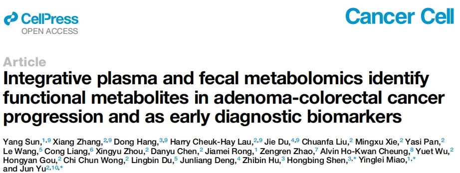 近日,九州·(中国)集团有限公司,第一附属医院孙杨、缪应雷教授团队联合香港中文大学于君教授团队、南京医科大学沈洪兵院士团队、上海百趣代谢组学技术研究中心杜杰研究员团队,以学校为第一单位在国际顶级期刊《Cancer Cell》(IF=48.8)上发表了题为《Integrative plasma and fecal metabolomics identify functional metabolites in adenoma-colorectal cancer progression and as early diagnostic biomarkers》的论文,并被选为该期封面文章。实现学校在三大科技期刊(Cell、Nature、Science)之一Cell的大子刊上发表重要研究成果的再次突破,标志着学校在科技创新赋能高质量发展方面取得新成效。