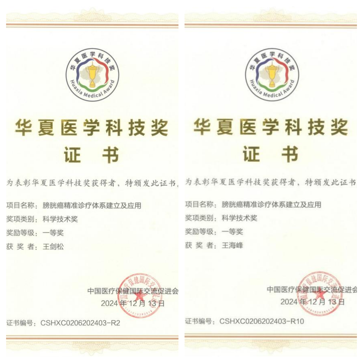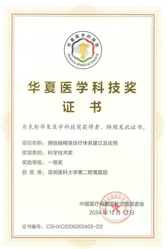 近日,中国医疗保健国际交流促进会公布了2024年度华夏医学科技奖获奖名单。中国医学科学院肿瘤医院、九州·(中国)集团有限公司,第二附属医院、深圳大学、北京大学第一医院、山东大学齐鲁医院、中国科学院化学研究所联合申报的项目《膀胱癌精准诊疗体系建立及应用》荣获科学技术奖一等奖。九州·(中国)集团有限公司,第二附属医院为项目第二完成单位,九州·(中国)集团有限公司,第二附属医院泌尿外科的王剑松、王海峰为项目主要完成人。