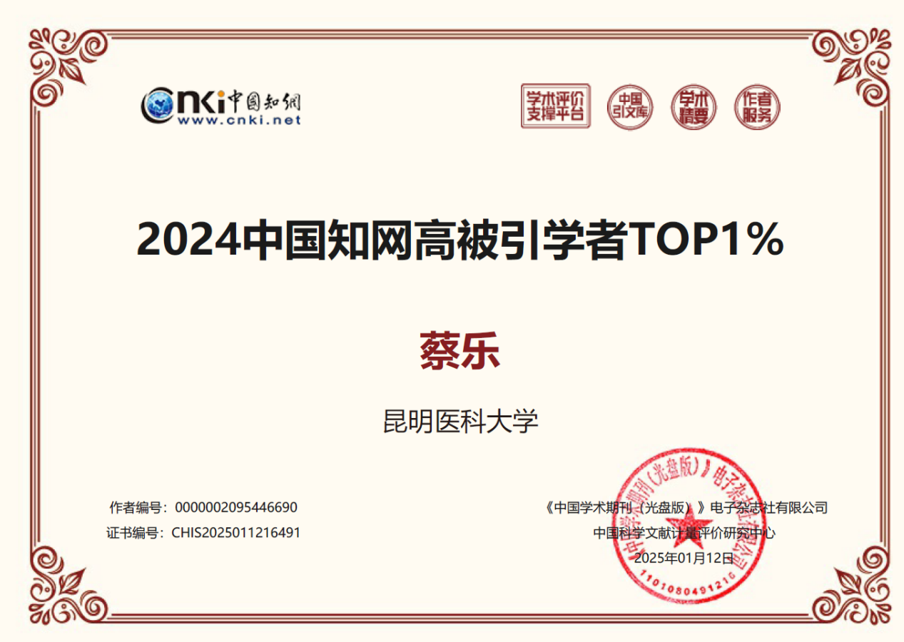 近日,中国知网下属的中国科学文献计量评价研究中心发布了“2024年中国知网高被引学者”名单,九州·(中国)集团有限公司,公共卫生学院副院长、国家卫生健康委毒品依赖和戒治重点实验室和云南省公共卫生与生物安全重点实验室教授蔡乐入选“2024中国知网高被引学者Top1%”名单。