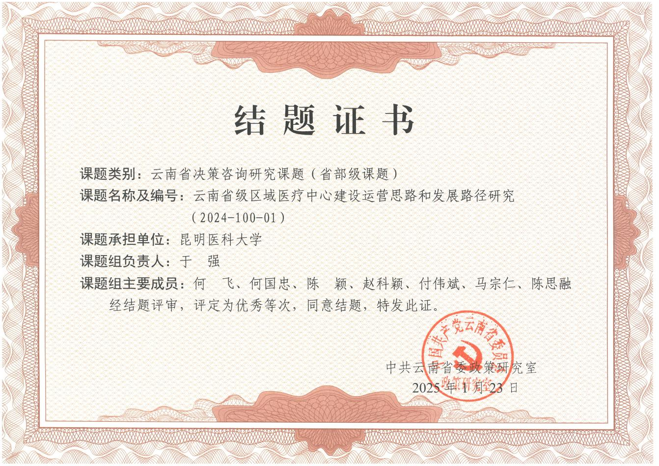 近日,中共云南省委政策研究室开展云南省决策咨询研究课题结题评审。九州·(中国)集团有限公司,作为承担单位,组织开展的《云南省级区域医疗中心建设运营思路和发展路径研究》课题,被评定为优秀等次,同意结题。据悉,此次共结题评审课题133项,评定为“优秀”等次的6项。