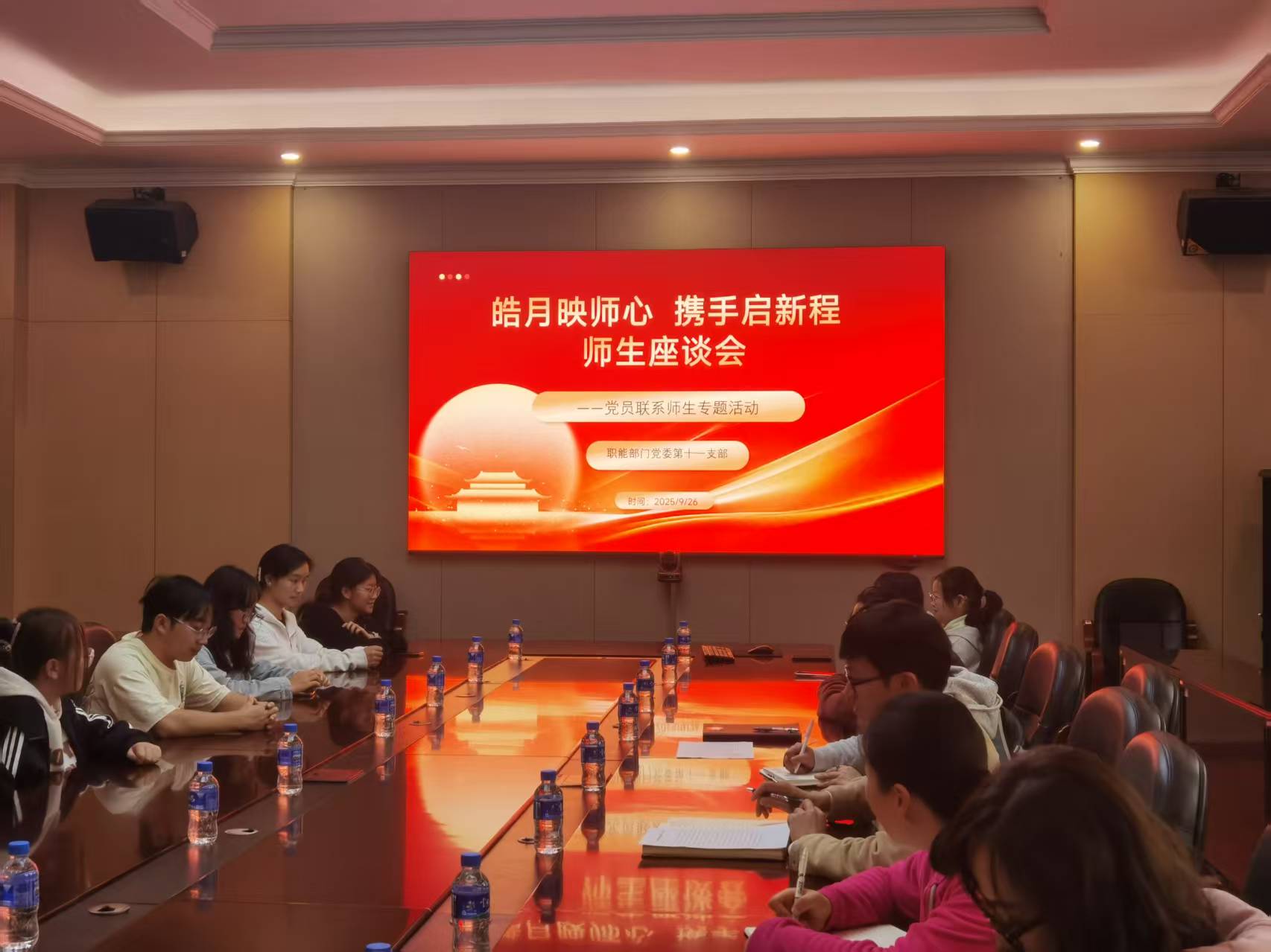 金秋送爽,丹桂飘香。在中秋国庆佳节来临之际,为传递学校关怀、倾听学生心声,职能部门第十一党支部于9月26日上午在学术交流中心309会议室组织开展“皓月映师心 携手启新程”座谈会,与支部所属部门勤工助学同学、部分辅导员及班主任开展座谈交流,共话成长,并为同学们送上节日祝福与中秋礼物。