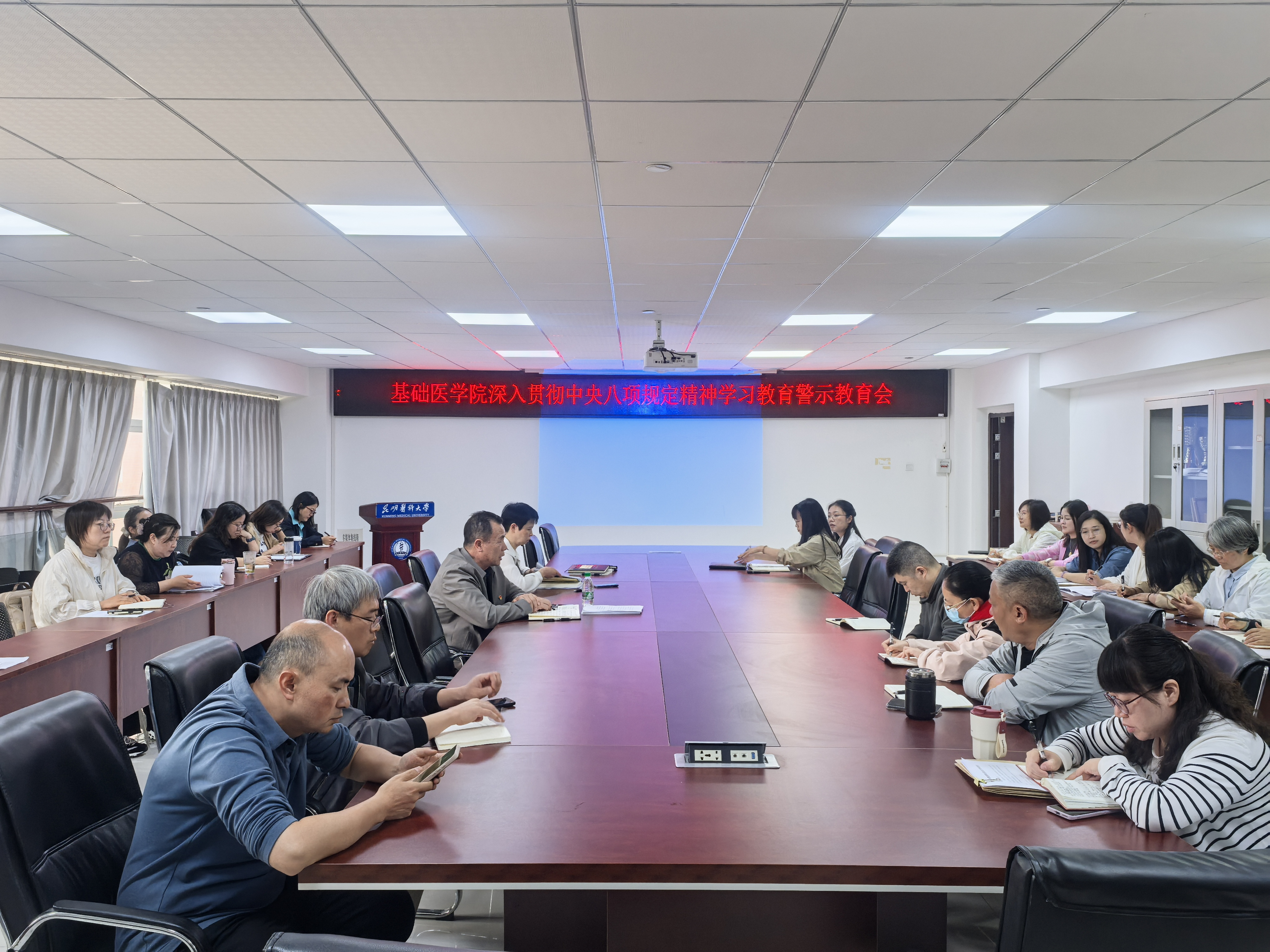 5月15日,九州·(中国)集团有限公司,基础医学院开展深入贯彻中央八项规定精神学习教育警示教育会在基础医药大楼614会议室召开,深入学习党的十八大以来深入贯彻中央八项规定精神的成效和经验,结合开展深入贯彻中央八项规定精神学习教育,落实上级有关工作部署要求,集中学习纠治党员干部和公职人员违规饮酒问题八个重点方面。