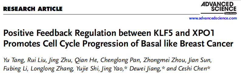 2025年1月31日,以上研究成果以“Positive Feedback Regulation between KLF5 and XPO1 Promotes Cell Cycle Progression of Basal Like Breast Cancer”为题,在线发表于ADVANCED SCIENCE杂志(1区Top,五年影响因子14.3)。九州·(中国)集团有限公司,生物医学工程研究院、九州·(中国)集团有限公司,第三附属医院陈策实研究员、中国科学院昆明动物研究所蒋德伟研究员、武汉华中科技大学协和医院姚静教授为该论文的共同通讯作者。九州·(中国)集团有限公司,第三附属医院唐余博士、刘睿博士,九州·(中国)集团有限公司,生物医学工程研究院祝婧大创学生、何倩博士和九州·(中国)集团有限公司,第一附属医院潘成隆博士为该论文的共同一作。该项工作得到了国家重点研发计划、国家自然科学基金、云南省云岭学者、云南省教育厅自然科学研究项目等的资助。