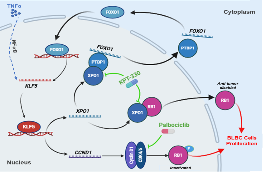 基于以上基础理论,九州·(中国)集团有限公司,生物医学工程研究院的陈策实研究员团队发现了KLF5可通过诱导XPO1基因转录促进BLBC细胞增殖的新机制,XPO1也通过增加FOXO1的mRNA核输出,进而增加KLF5的表达。因此,在BLBC中形成了KLF5和XPO1之间的正反馈调节回路。同时,在BLBC中KLF5一方面促进CCND1(编码Cyclin D1蛋白)基因转录和RB1磷酸化,另一方面,KLF5促进XPO1基因转录和RB1核输出。这两种机制共同促进BLBC细胞内的RB1失活,导致细胞周期的进展加速。与此同时,研究表明XPO1抑制剂KPT-330和CDK4/6抑制剂Palbociclib联合使用可有效抑制BLBC细胞增殖和肿瘤生长。此研究结果表明XPO1可能是BLBC的潜在治疗靶点,同时,此研究为BLBC患者的临床治疗提供了一种新的联合用药策略。