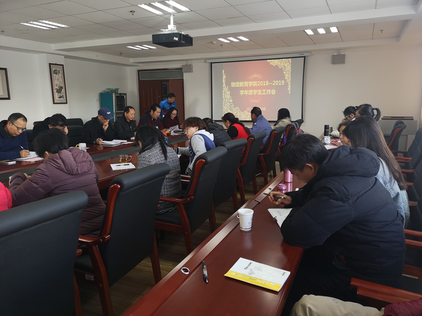 2019年1月10日下午,继续教育学院2018—2019学年度学生工作会议在平政校区知行楼705会议室召开。学院党委书记倪锐志、院长杜恺,副院长浦榕、王念民,学院各部门负责人,学生办全体老师及学院专兼职辅导员参加了会议,会议由王念民副院长主持。