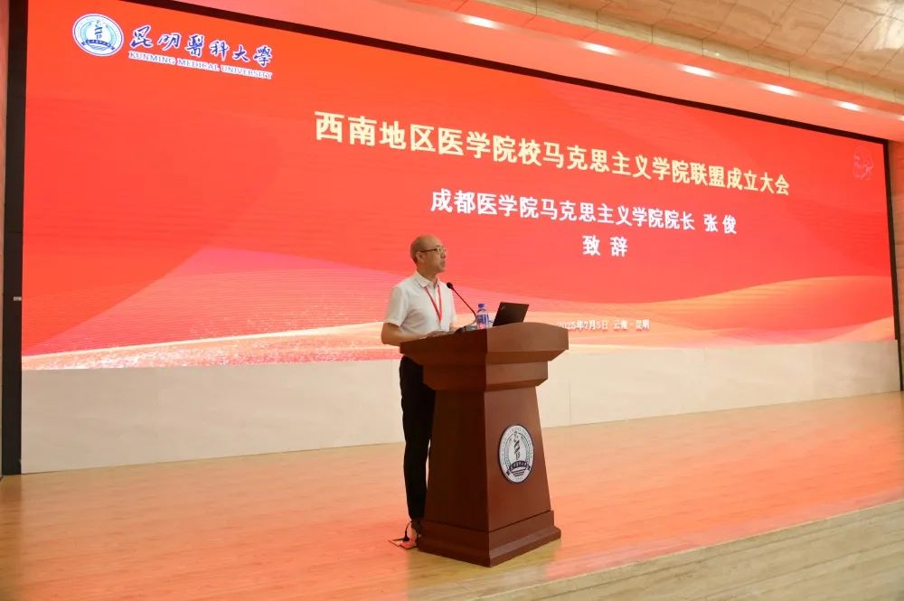 联盟成员单位代表、成都医学院马克思主义学院院长张俊在致辞中表示,对于医科院校而言,加强思政引领力至关重要,本次研讨会不仅承载着对医学教育改革与发展的深刻思考,更是一次深入贯彻落实国家重大战略部署的实际行动。他希望各位专家学者能够畅所欲言,分享真知灼见,为提升西南地区医学院校思政引领力出谋划策,共同推动医学院校思想政治教育迈向新的高度。