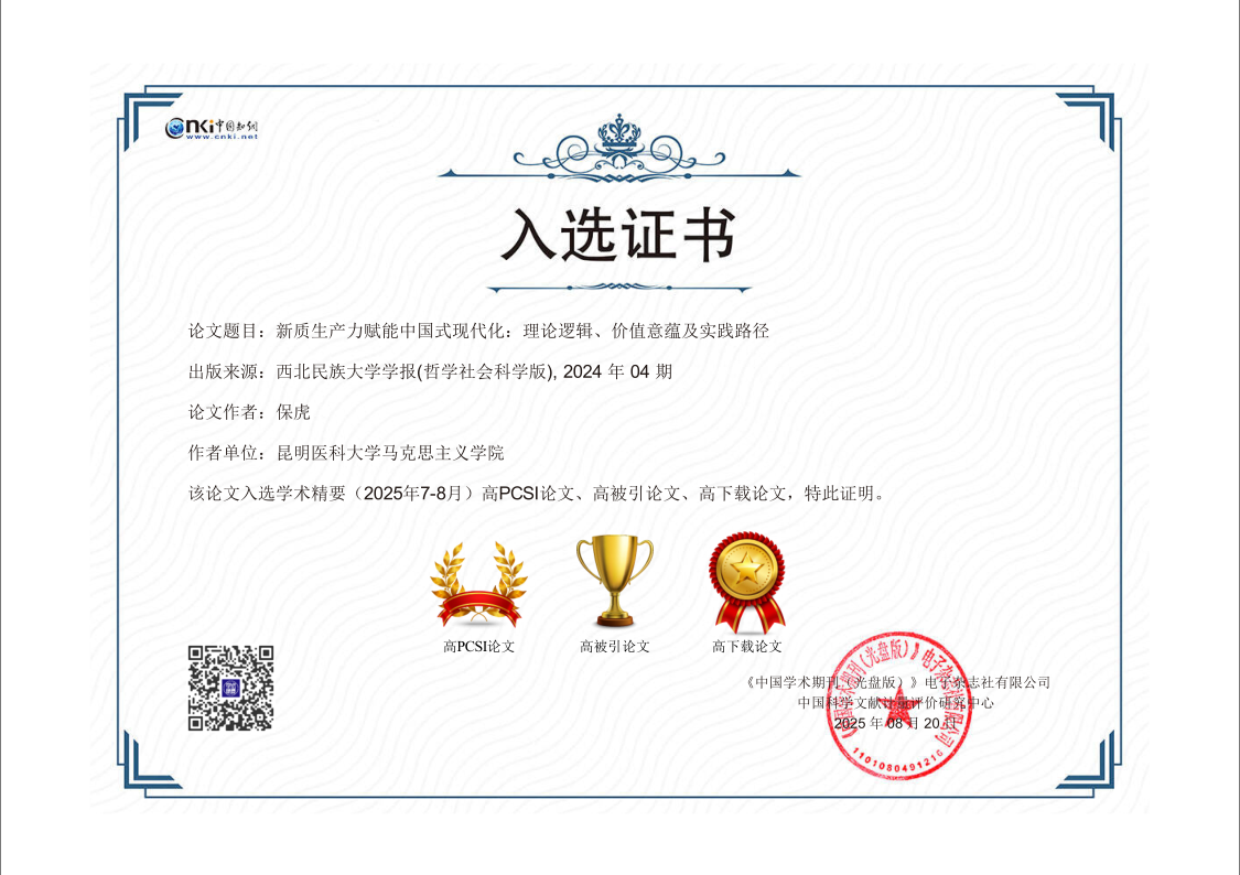 近日,被称为“中国的ESI数据库”的中国知网学术精要数据库发布了2011年以来的高影响力论文。我院保虎教授于2024年8月发表的论文《新质生产力赋能中国式现代化:理论逻辑、价值意蕴及实践路径》,成功入选中国知网学术精要(2025年7-8月)高PCSI论文、高被引论文、高下载论文。