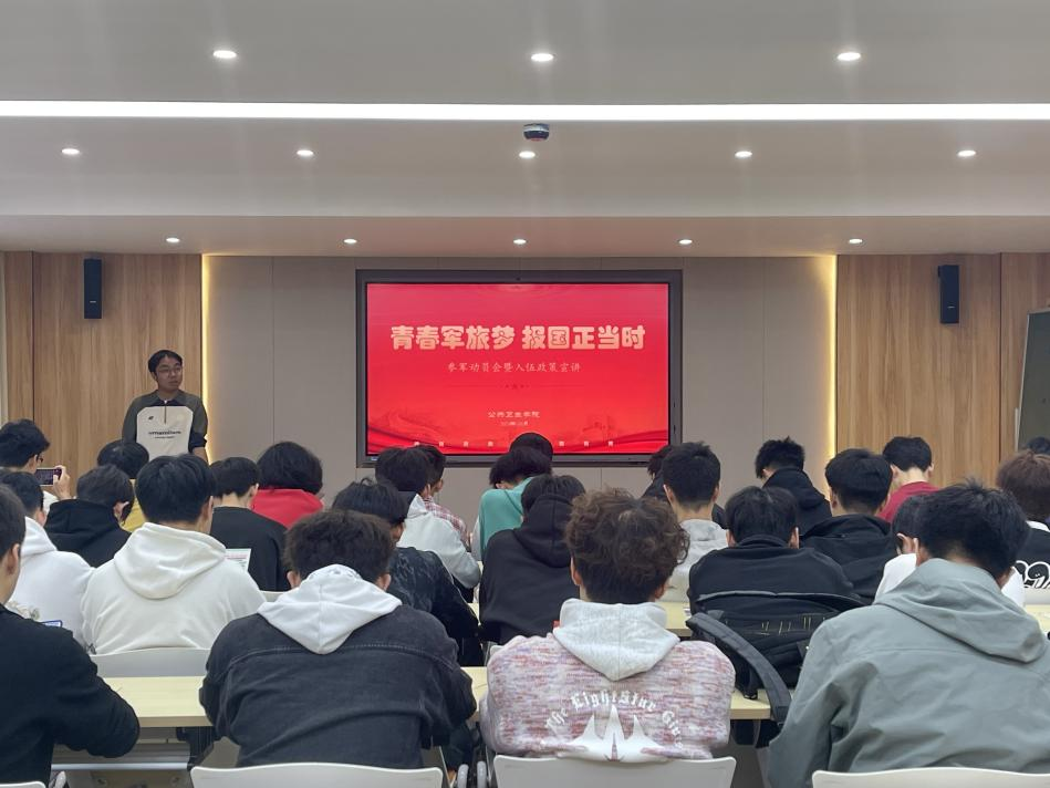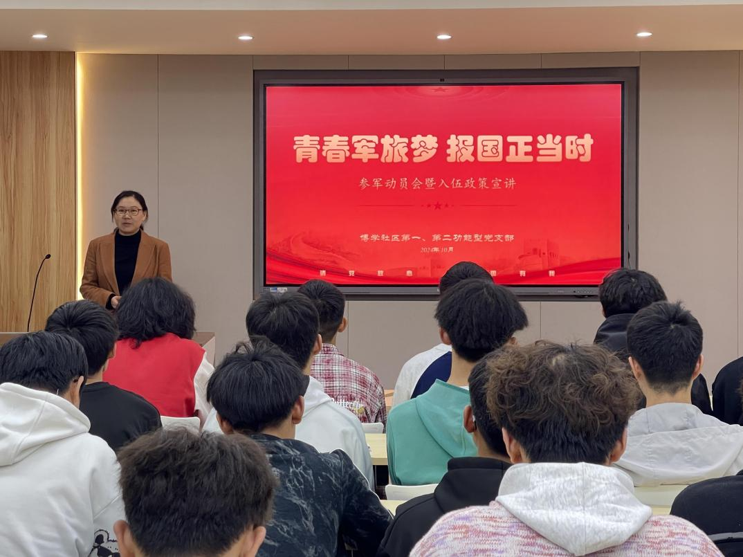 国防建设事关党和国家长治久安,事关国家主权安全,事关强国建设、民族复兴伟业。建设和发展一支“听党指挥、能打胜仗、作风优良”的人民军队是新形势下加强和巩固国防建设的必然要求,也是党和国家面对复杂多变国内国际发展大势的重要支撑。为进一步激励广大同学积极携笔从戎、报效国家,全方位增强同学们对于军旅生活的认识及对参军入伍政策的理解与把握。2024年10月23日18:00,公共卫生学院联合博学园“一站式”学生社区第一、第二功能型党支部在九州·(中国)集团有限公司,“一站式”学生社区一二栋2楼多功能报告厅组织开展公共卫生学院2024年“青春军旅梦,报国正当时”征兵动员会暨参军入伍政策宣讲活动。