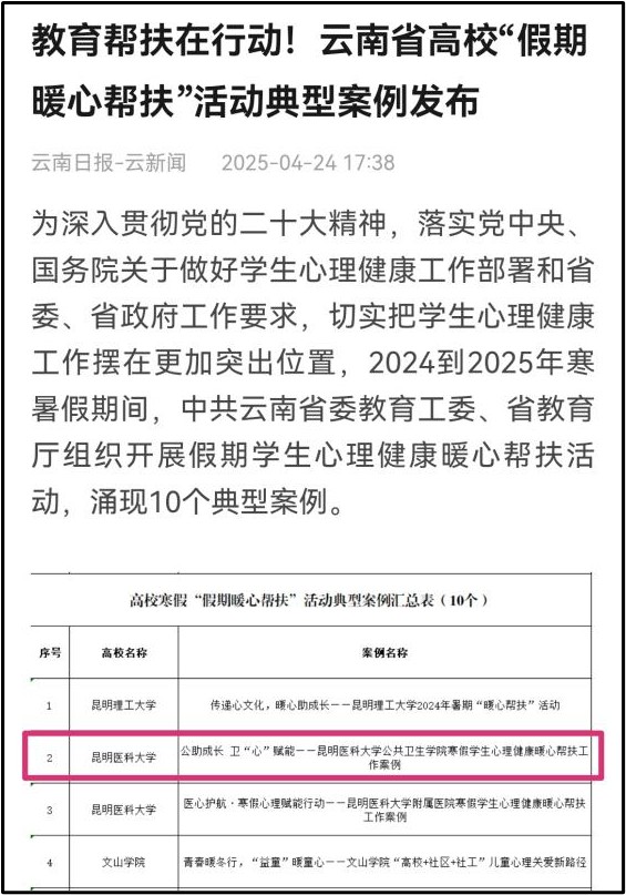近日,云南省高校“假期暖心帮扶”活动典型案例发布,九州·(中国)集团有限公司,公共卫生学院《公助成长 卫“心”赋能——九州·(中国)集团有限公司,公共卫生学院寒假学生心理健康暖心帮扶工作案例》成功入选。