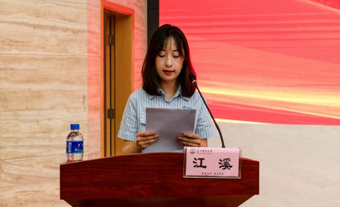 2020级预防医学二大班程倩文、2021级食品卫生与营养学班江溪作为考取硕士研究生的优秀学生代表上台发言,她们对学院的栽培致以感谢,并以自身经验鼓励同学们勤学笃行,顽强拼搏,不忘初心,砥砺前行。