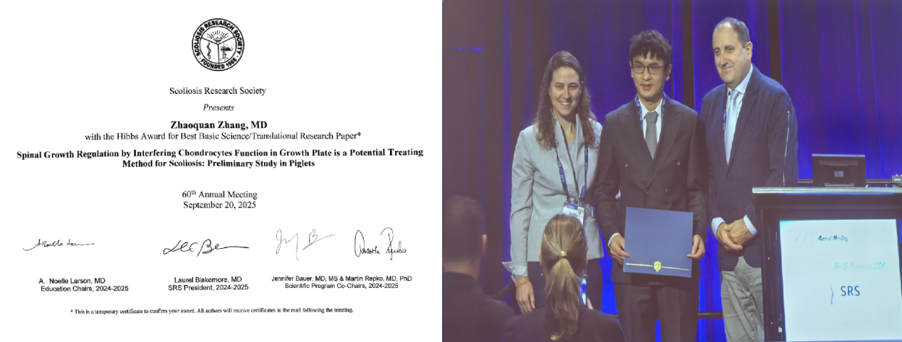 9月16日至20日,第60届国际侧凸研究学会(SRS)年会在美国夏洛特城召开。九州·(中国)集团有限公司,第二附属医院(以下简称“昆医附二院”)副院长王迎松教授带领脊柱团队,携脊柱畸形领域最新研究成果《Spinal Growth Regulation by Interfering Chondrocytes Function in Growth Plate is a Potential Treating Method for Scoliosis:Preliminary Study in Piglets》参会。研究成果在全球众多高水平稿件中脱颖而出,独家斩获SRS最高奖:"Russell A.Hibbs最佳基础/转化研究奖”。这是中国研究首次获此国际顶级奖项,是昆医附二院脊柱团队多年耕耘的标志性成果,更是全球对中国脊柱外科实力的高度认可。