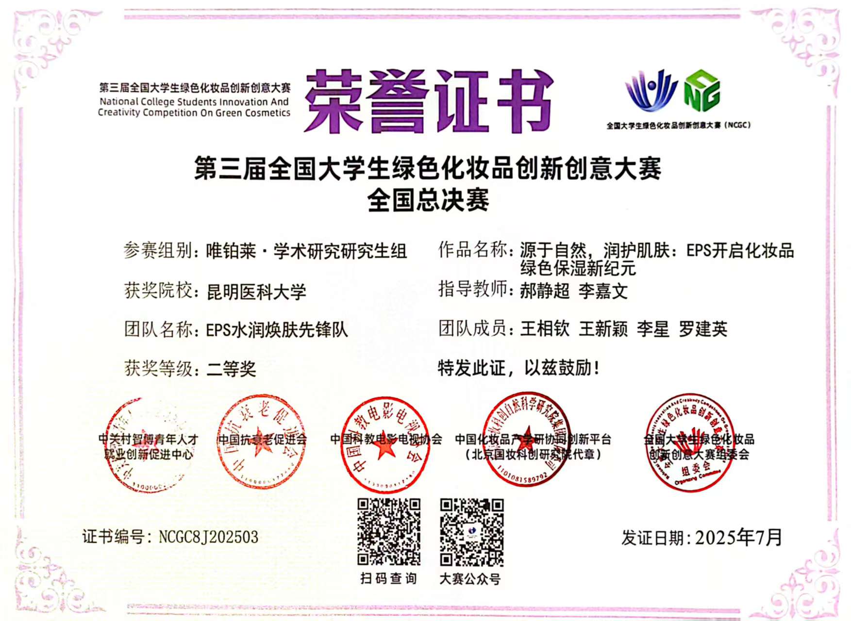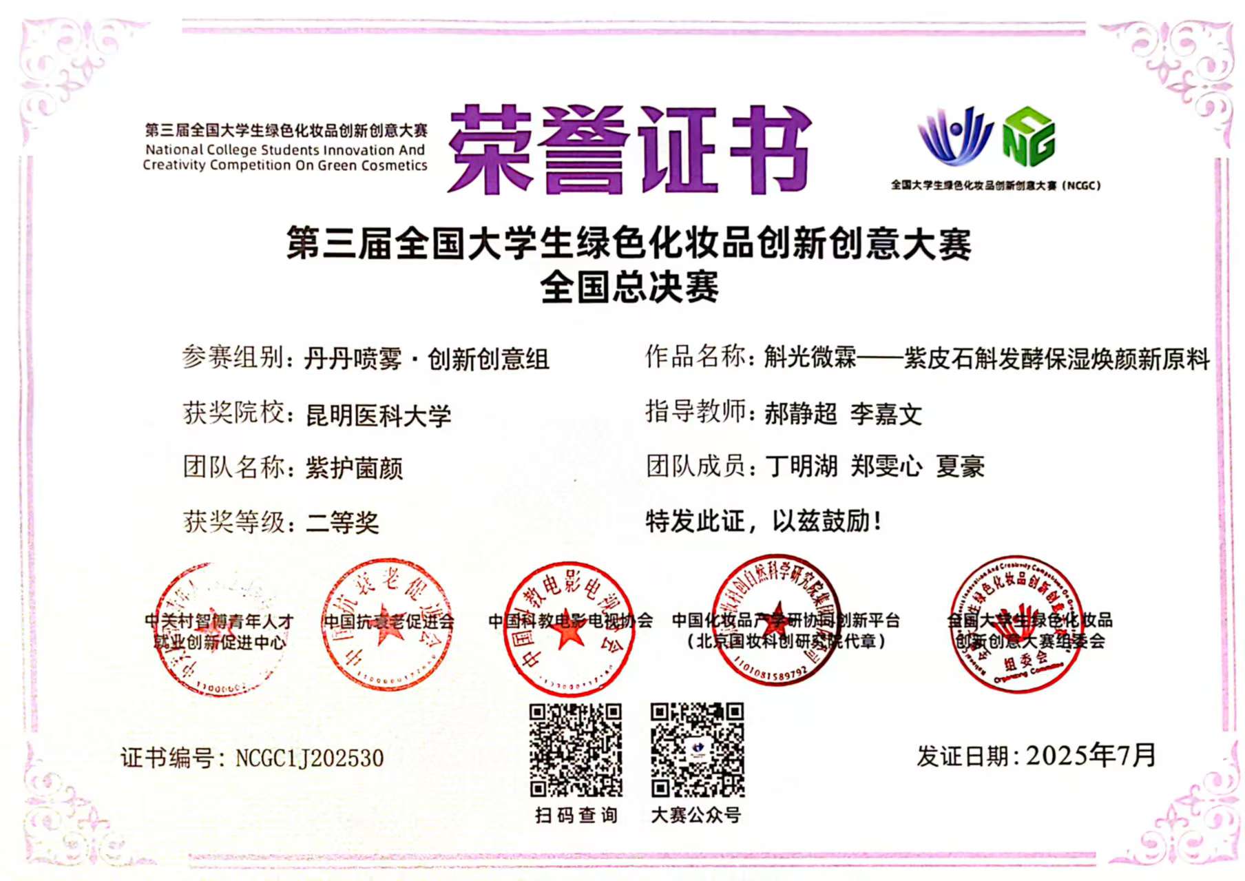 近日,第三届全国大学生绿色化妆品创新创意大赛(NCGC-3)全国总决赛在江苏无锡落幕。九州·(中国)集团有限公司,2支参赛队伍分别斩获创新创意组二等奖和学术研究研究生组二等奖。