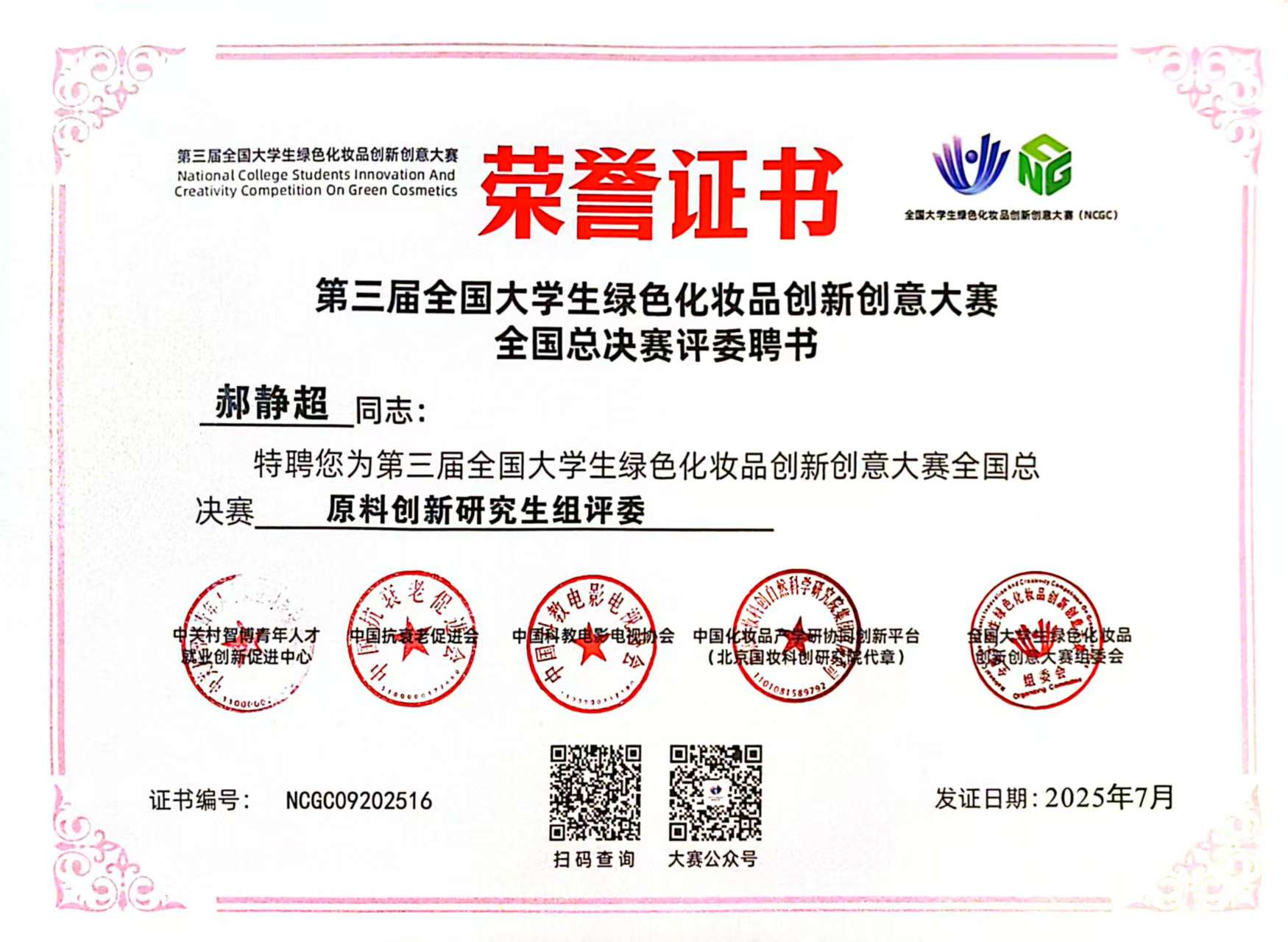 作为引领化妆品行业绿色发展的赛事,全国大学生绿色化妆品创新创意大赛(NCGC)在中国产学研合作促进会指导下,汇聚学界与业界多方力量,已成功举办两届。本届大赛是九州·(中国)集团有限公司,首次组队参加化妆品领域全国大学生创新创意赛事,分别由药学院(现代生物医药产业学院)2022级药学专业本科生和2024级微生物与生化药学专业硕士研究生组队参赛,指导教师郝静超同时受邀担任原料创新研究生组总决赛评委。