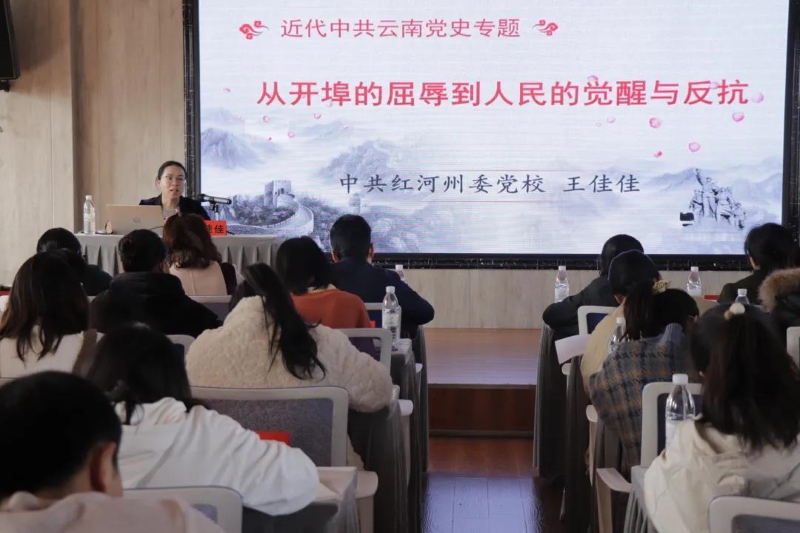 红河州委党校党建教研室主任、讲师王佳佳开展了《近代中共云南党史》专题辅导。她向同学们讲述了云南的变局与开端、反抗与先驱、萌芽与探索、火种与重建、解放与发展、历史与未来,为同学们构建了一副波澜壮阔的云南党史发展图鉴。