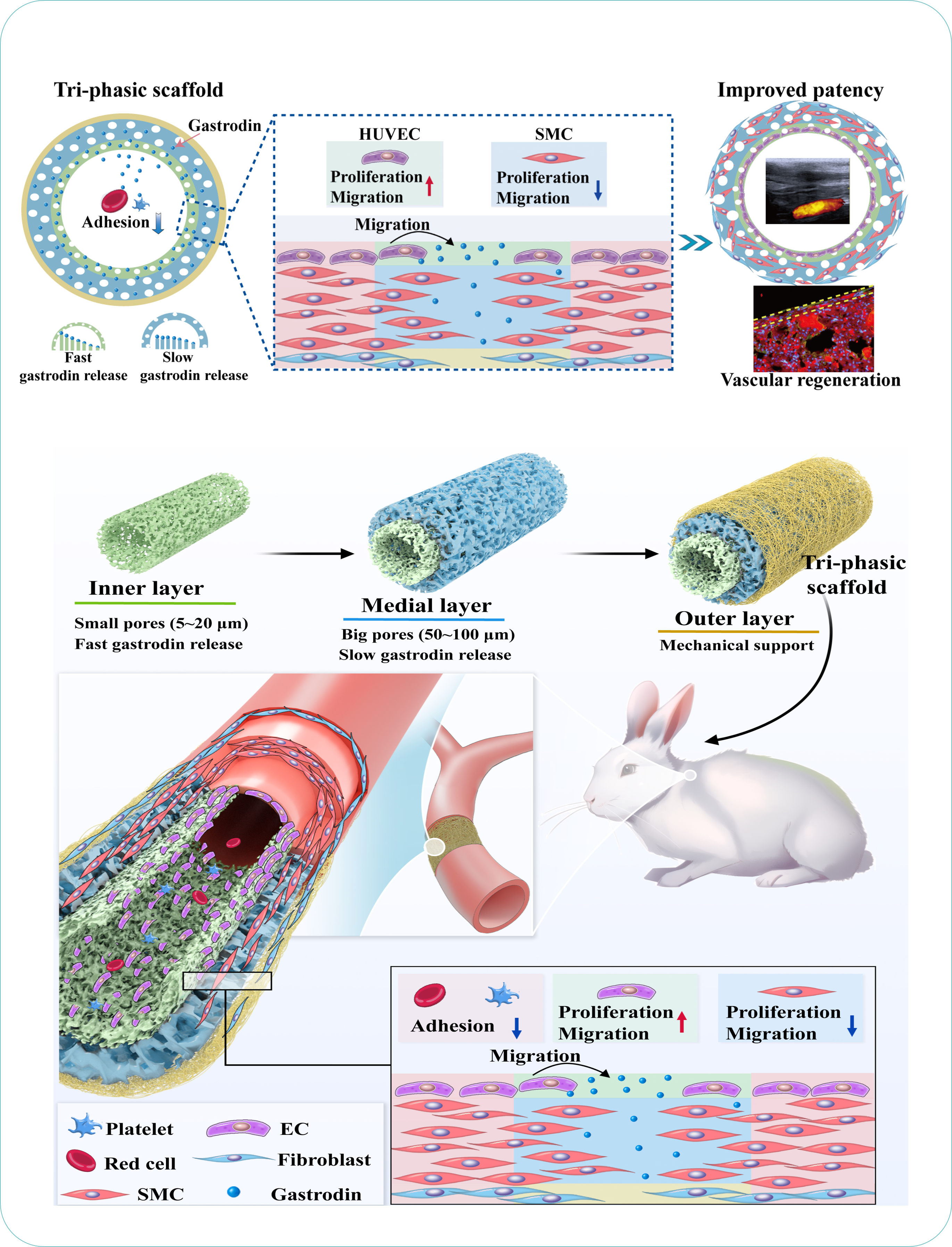 孙林教授团队构建了一种具天麻素层级缓释的三相血管支架,分类调控内膜层的再生和平滑肌细胞迁移的适度抑制,保持血管的高通畅率和促进层级血管再生。研究成果“A biomimetic tri-phasic scaffold with spatiotemporal patterns of gastrodin to regulate hierarchical tissue-based vascular regeneration”发表于  Bioactive Materials,IF = 18.9。