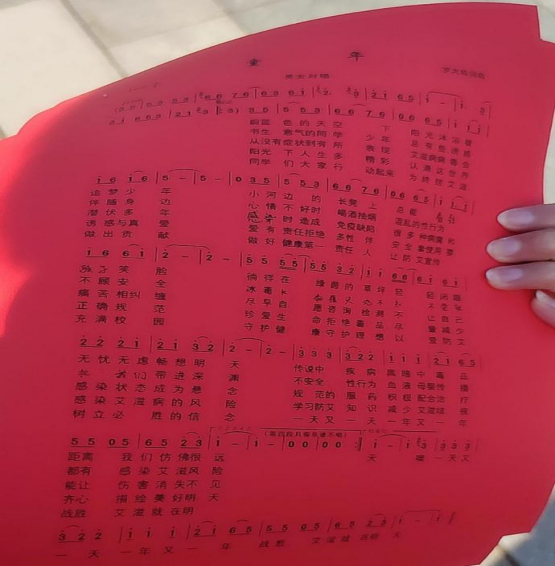 活动最后,志愿者们摆出了世界艾滋病日的标志——红丝带,象征着大众对艾滋病病毒感染者和艾滋病病人的关心与支持,大家共同练习合唱曲目《童年(改编版)》,歌词蕴含深意,告诫青少年要珍惜青春年华,守护健康守护理想。