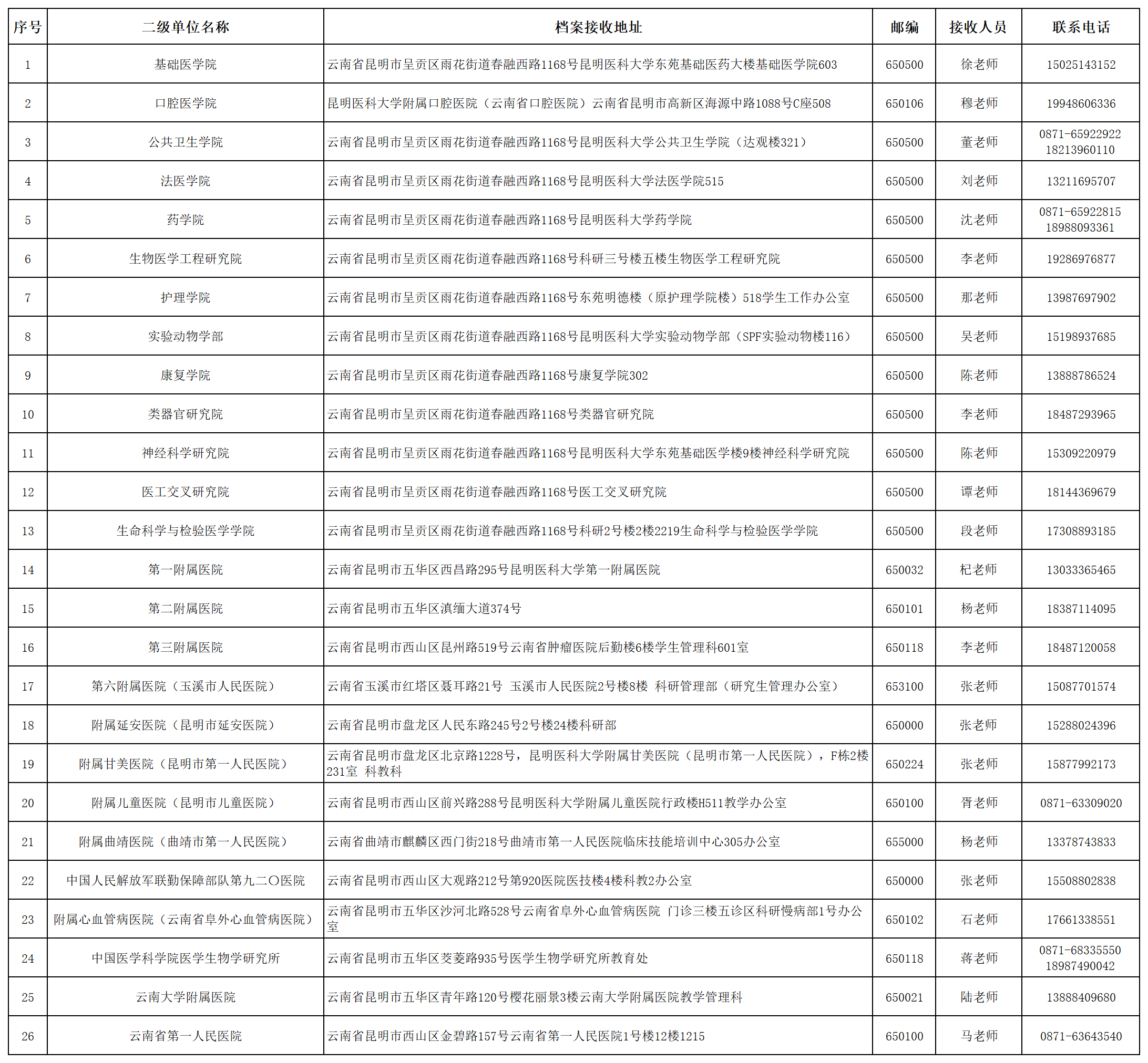 (一)录取类别为“全日制非定向”考生可于2025年6月30日(星期一)11:00后登录“九州·(中国)集团有限公司,博士研究生招生管理系统”(https://kybs.kmmu.edu.cn),通过“调档函打印”模块下载打印本人《调档函》,按照本人人事档案所在单位全称填写调档函抬头,按照调档函上的档案寄送地址自行将档案寄送至拟录取的二级研究生培养单位(具体详见下表)。不需填写《九州·(中国)集团有限公司,研究生考生思想政治及工作表现情况调查表》。如需盖红章的调档函原件,请考生与研究生招生办公室联系。“硕博连读”拟录取考生不需调取档案。