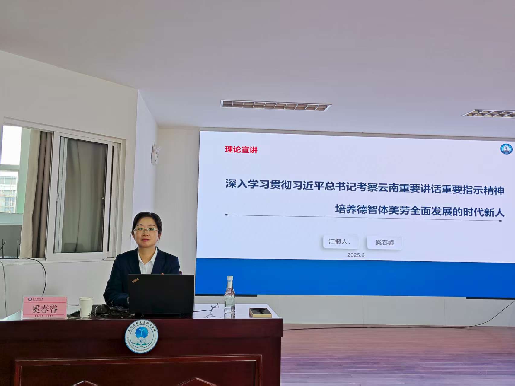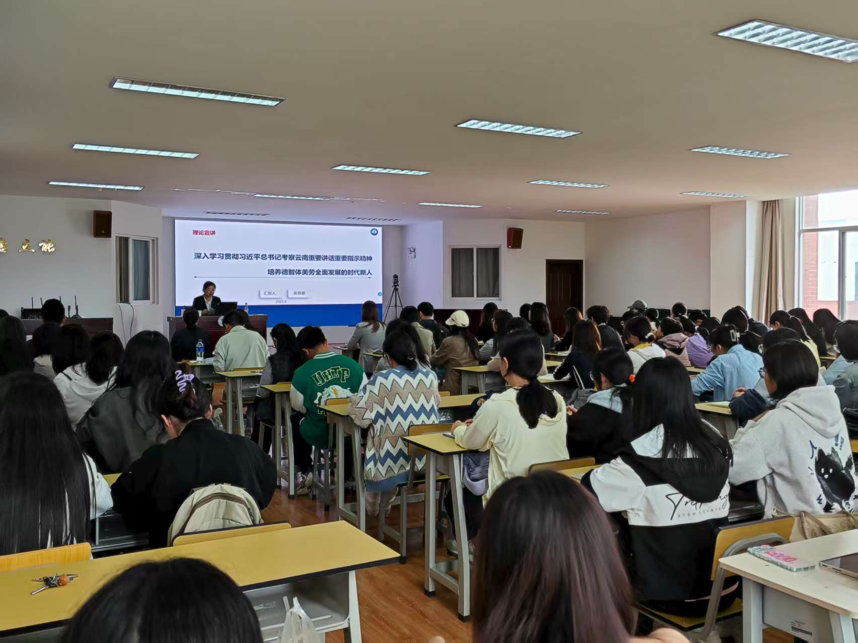 专题辅导中,奚春睿以“深入学习贯彻习近平总书记考察云南重要讲话重要指示精神 培养德智体美劳全面发展的时代新人”为题,深入浅出地阐释习近平总书记考察云南重要讲话重要指示精神,全院教师要在教育教学工作中以培育堪当大任的时代新人为目标,勉励全体学生争做坚定不移听党话、跟党走,做有理想、敢担当、能吃苦、肯奋斗的新时代好青年。