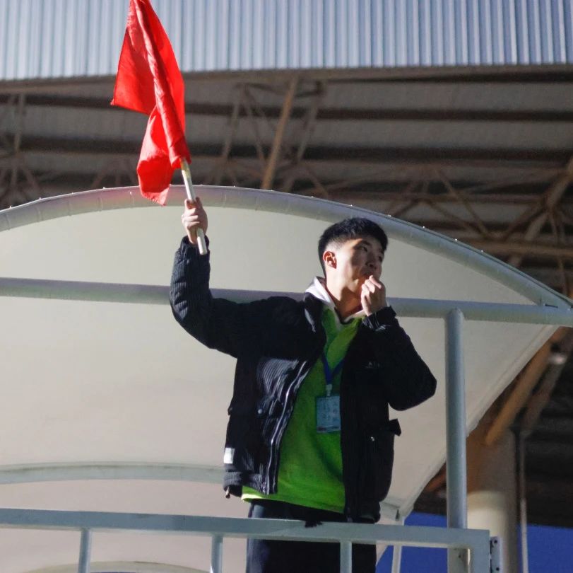 跳远部的志愿者们在运动员完成动作后用小旗标记距离并将沙坑填平,同时记录下运动员的成绩。每一次弯腰,每一次挥铲,都为运动员们增添了一份安心。